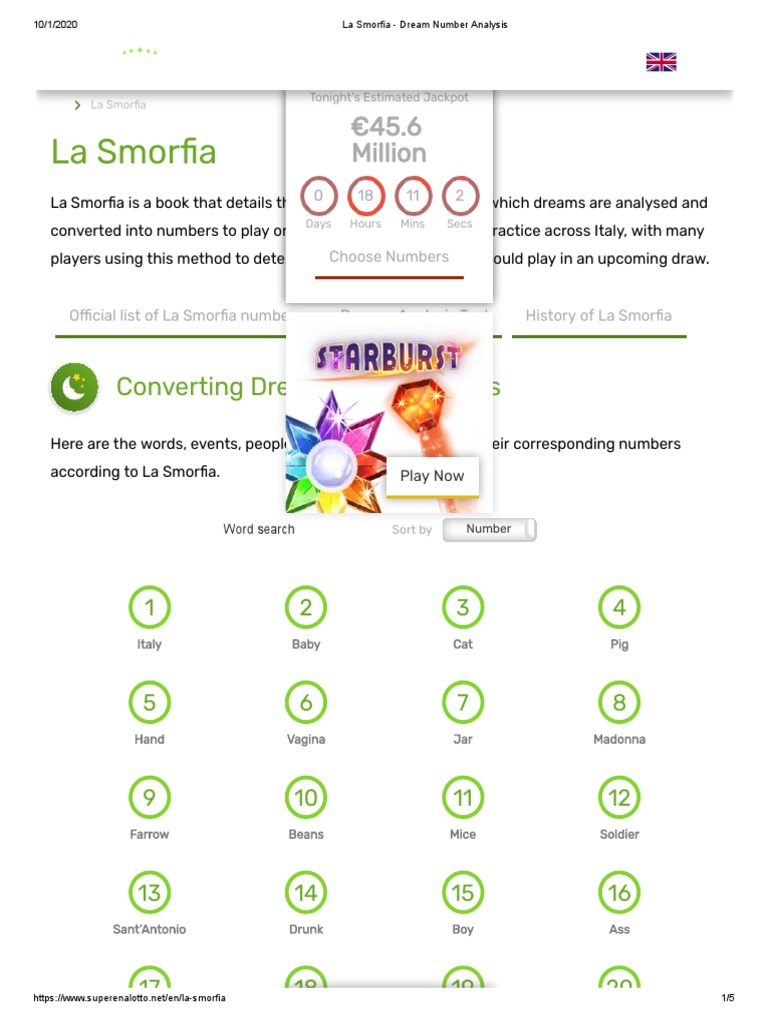 Smorfia napoletana. Il significato dei sogni e dei numeri Smorfia napoletana. Il significato dei sogni e dei numeri Descrivi un evento accaduto oppure inserisci le parole chiavi degli elementi più rilevanti del tuo sogno. Scopri il significato e l'interpretazione e trova i numeri da 1 a 90 da giocare al Lotto e Superenalotto. Purtroppo la Smorfia napoletana non garantisce vincite.